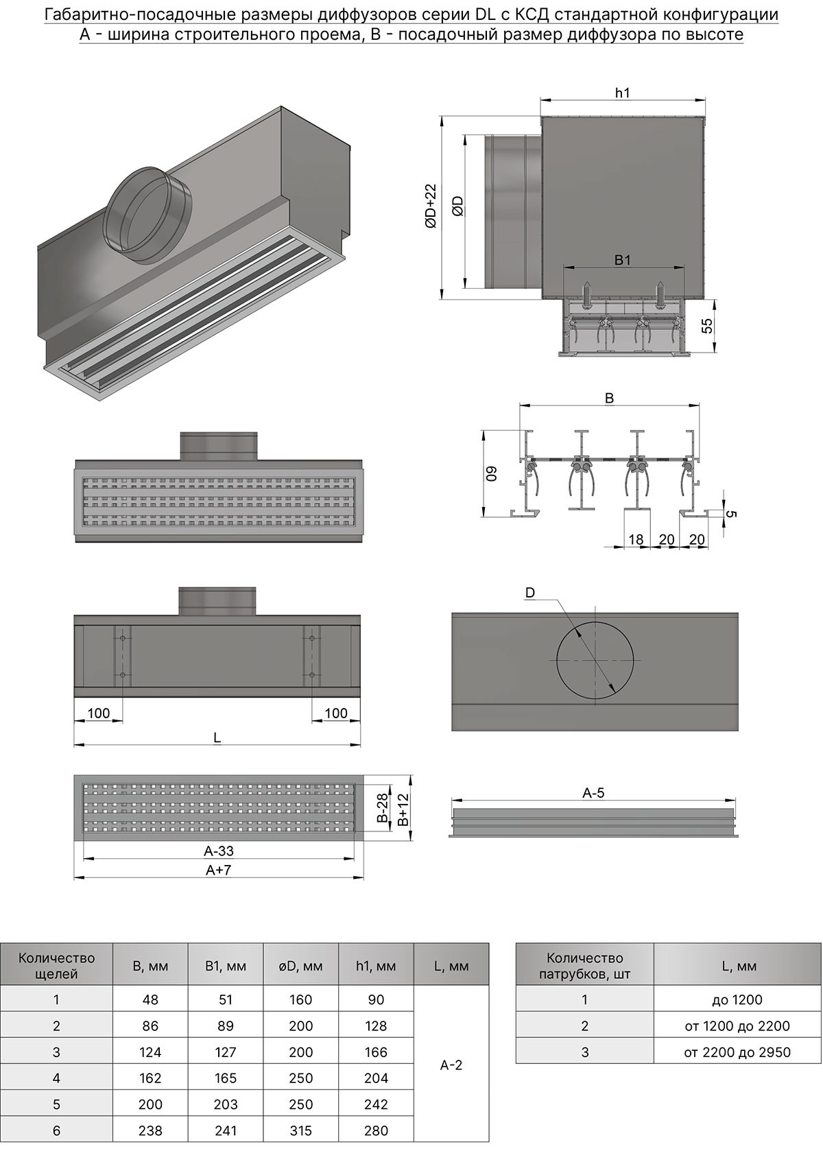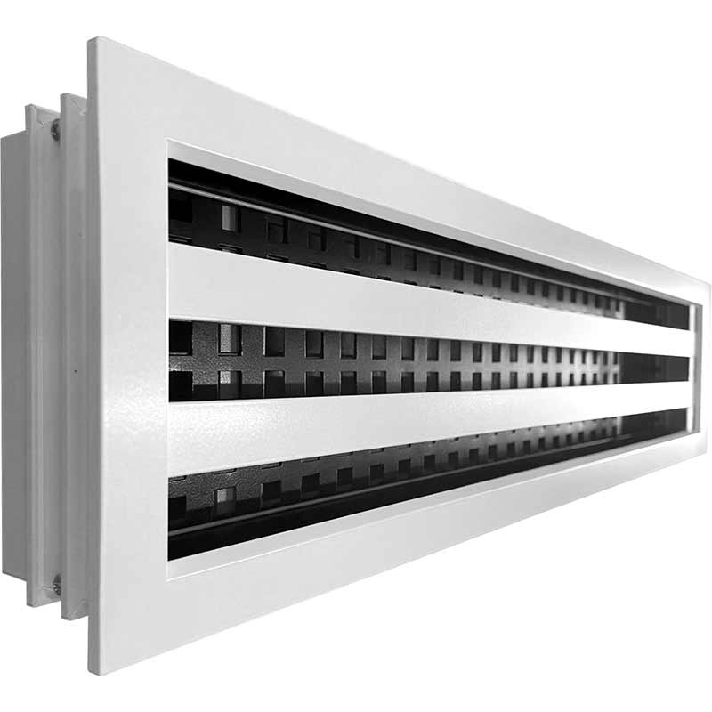 Диффузоры представляют собой декоративную рамку со встроенными неподвижными жалюзи, которые образуют щели (до 10 щелей). Внутреннее исполнение решетки зависит от ее функционального назначения. Они могут быть снабжены ламелями с выравнивателем потока воздуха, регулирующими направление приточной струи в заданную область помещения. Путём регулирования направляющих устройств можно получить распространение воздуха по горизонтали в том и другом направлении, либо по вертикали, без изменения объёма воздуха. Для регулирования объема подаваемого воздуха, диффузор дополнительно оснащается клапаном расхода воздуха. Диффузоры данной серии могут изменять расход до 60% при сохранении устойчивости потока. Их можно использовать на высоте от 2,6 до 4-х метров, при перепаде температур до 12 C.
